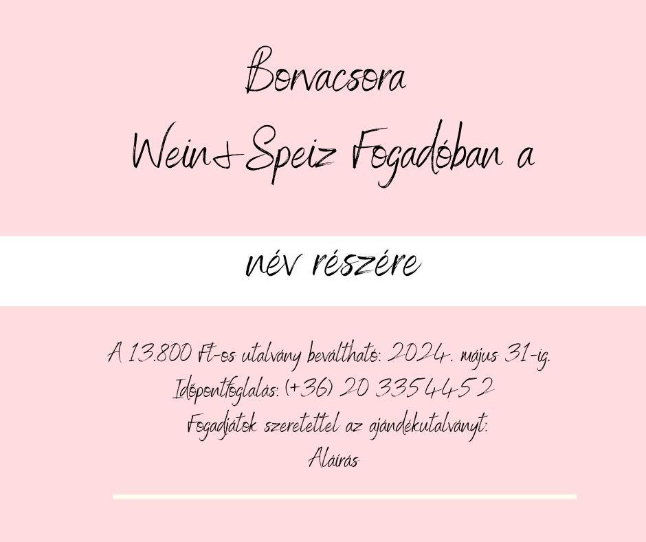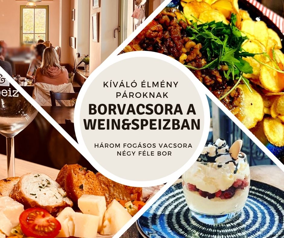 Kellemes és igényes helyen helyi ízeken alapuló borvacsora a Wein&Speiz Fogadóban. A három fogásos gyertyafényes vacsorához megfelelő három bort kínálunk. A menü a helyszínen lehet egyeztetni. Alapajánlatunk: gyöngyöző White Bubble saját érlelt sajtjaink sajttálával, Zsályás-sonkáskaraj boron megfuttatva saját balzsamecetes salátával hozzá egy pohár friss Rosé, majd Sárkányok kedvence desszertünk Cabernet Franc-nal.